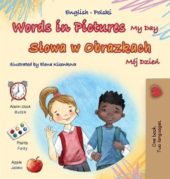 English Polish Bilingual children's book. Perfect for kids learning English or Polish as their second language. This is a fun and colorful book for kids ages 3-5. Each page shows a part of a child's day, like waking up, eating breakfast, or playing with friends. Important words, like "toothbrush," "apple," and "blanket," are shown in the pictures and also separately illustrated. This helps kids learn to recognize and read the words while exploring their world. With bright illustrations and simple words, this book makes learning fun and easy!