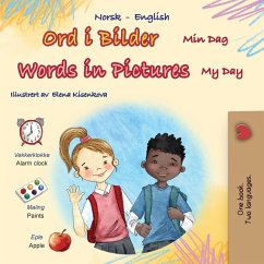 Norwegian English Bilingual children's book. Perfect for kids learning English or Haitian Creole as their second language. This is a fun and colorful book for kids ages 3-5. Each page shows a part of a child's day, like waking up, eating breakfast, or playing with friends. Important words, like "toothbrush," "apple," and "blanket," are shown in the pictures and also separately illustrated. This helps kids learn to recognize and read the words while exploring their world. With bright illustrations and simple words, this book makes learning fun and easy!