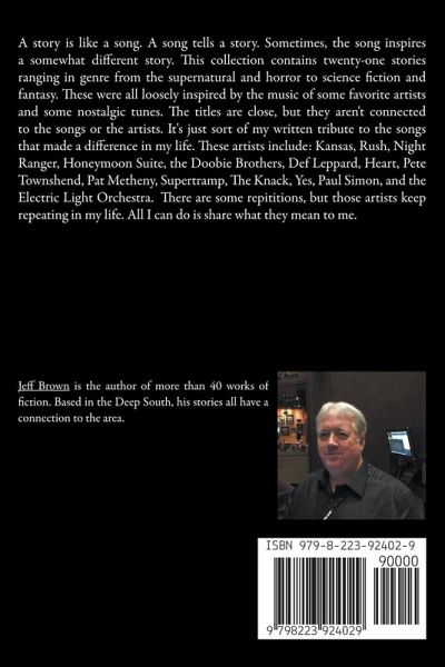 A story is like a song. A song tells a story. Sometimes, the song inspires a somewhat different story. This collection contains twenty-one stories ranging in genre from the supernatural and horror to science fiction and fantasy. These were all loosely inspired by the music of some favorite artists and some nostalgic tunes. The titles are close, but they aren't connected to the songs or the artists. It's just sort of my written tribute to the songs that made a difference in my life. These artists include: Kansas, Rush, Night Ranger, Honeymoon Suite, the Doobie Brothers, Def Leppard, Heart, Pete Townshend, Pat Metheny, Supertramp, The Knack, Yes, Paul Simon, and the Electric Light Orchestra. There are some repititions, but those artists keep repeating in my life. All I can do is share what they mean to me.