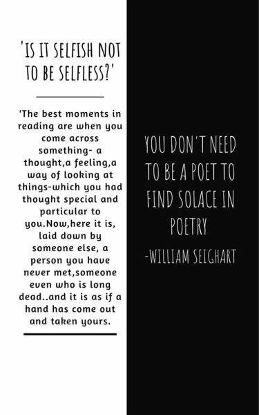 In the words of William Seighart..you don't need to be a poet to find solace in poetry. The best moments in reading are when you come across something- a thought,a feeling,a way of looking at things-which you had thought special and particular to you.Now,here it is, laid down by someone else, a person you have never met,someone even who is long dead..and it is as if a hand has come out and taken yours. Find a poem in this book that fits your need.