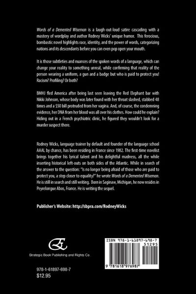 Words of a Demented Wiseman is a laugh-out-loud satire cascading with a mastery of wordplay and author Rodney Wicks' unique humor. This ferocious, bombastic novel highlights race, identity, and the power of words, categorizing nations and their descendants before you can even pop open your mouth.It is those subtleties and nuances of the spoken words of a language which can change your reality to something unreal, while confirming that reality of the person wearing a uniform, a gun, and a badge but who is paid to protect you! Racism? Profiling? Or both?BMHJ fled America after being last seen leaving the Red Elephant bar with Nikki Johnson, whose body was later found with her throat slashed, 48 stab wounds, and a $50 bill protruded from her vagina. And, of course, the condemning evidence, her DNA from her blood was all over his clothes. How could he explain? Hiding out in a French psychiatric clinic, he figured they wouldn't look for a murder suspect there. Rodney Wicks, language trainer by default and founder of the language school AAAL by chance, has been residing in France since 1982. The first-time novelist brings together his lyrical talent and his delightful madness, all the while inserting historical left-outs on both sides of the Atlantic. While in search of the answer to the question: "Is no longer being afraid of those who are paid to protect you, a step closer to equality?" he wrote Words of a Demented Wiseman. He is still in search and still writing. Born in Saginaw, Michigan, he now resides in Peyrelongue Abos, France. He is writing the sequel.Publisher's website: http://sbpra.com/RodneyWicks