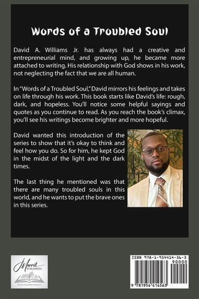 David A. Williams Jr. has always had a creative and entrepreneurial mind, and growing up, he became more attached to writing. His relationship with God shows in his work, not neglecting the fact that we are all human. In "Words of a Troubled Soul," David mirrors his feelings and takes on life through his work. This book starts like David's life: rough, dark, and hopeless. You'll notice some helpful sayings and quotes as you continue to read. As you reach the book's climax, you'll see his writings become brighter and more hopeful. David wanted this introduction of the series to show that it's okay to think and feel how you do. So for him, he kept God in the midst of the light and the dark times. The last thing he mentioned was that there are many troubled souls in this world, and he wants to put the brave ones in this series.