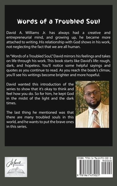 David A. Williams Jr. has always had a creative and entrepreneurial mind, and growing up, he became more attached to writing. His relationship with God shows in his work, not neglecting the fact that we are all human. In "Words of a Troubled Soul," David mirrors his feelings and takes on life through his work. This book starts like David's life: rough, dark, and hopeless. You'll notice some helpful sayings and quotes as you continue to read. As you reach the book's climax, you'll see his writings become brighter and more hopeful. David wanted this introduction of the series to show that it's okay to think and feel how you do. So for him, he kept God in the midst of the light and the dark times. The last thing he mentioned was that there are many troubled souls in this world, and he wants to put the brave ones in this series.