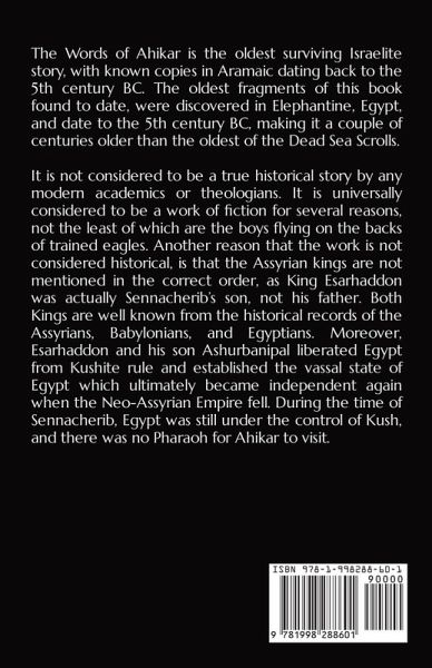 The Words of Ahikar is the oldest surviving Israelite story, with known copies in Aramaic dating back to the 5th century BC. As it has been translated into many languages over the past two and a half millennia, it now has several names and translations, including the Words of Ahiqar, the Story of Ahikar, and various variations of the name, including Achiacharos, from the Greek translation, ¿¿yqr from the Aramaic translation, Akyrios from the Old Slavonic translation, ¿ayq¿r from the Arabic translation, and Xikar from the Armenian translation. This translation uses the most common English variation of Ahikar, which is based on a transliteration of the oldest surviving Aramaic version of the name. The oldest fragments of this book found to date, were discovered in Elephantine, Egypt, and date to the 5th century BC, making it a couple of centuries older than the oldest of the Dead Sea Scrolls.It is not considered to be a true historical story by any modern academics or theologians. It is universally considered to be a work of fiction for several reasons, not the least of which are the boys flying on the backs of trained eagles. Another reason that the work is not considered historical, is that the Assyrian kings are not mentioned in the correct order, as King Esarhaddon was actually Sennacherib's son, not his father. Both Kings are well known from the historical records of the Assyrians, Babylonians, and Egyptians. Moreover, Esarhaddon and his son Ashurbanipal liberated Egypt from Kushite rule and established the vassal state of Egypt which ultimately became independent again when the Neo-Assyrian Empire fell. During the time of Sennacherib, Egypt was still under the control of Kush, and there was no Pharaoh for Ahikar to visit.The book also refers to a King of Persia, centuries before there was a Kingdom of Persia, and is therefore generally dismissed as a quasi-historical work of fiction. Nevertheless, the Book of Tobit records that Ahikar was sent to Elam as an envoy, not Persia. As the Persians settled in the land of Elam after King Ashurbanipal destroyed Elam in the mid 7th century BC, the name Persia would have been the contemporary geographical term when the Aramaic translation was made, and not the original term. In any event, the author of Tobit must have had a copy of Ahikar that used the name Elam instead of Persia, or his reference to Ahikar going to Elam makes no sense.
