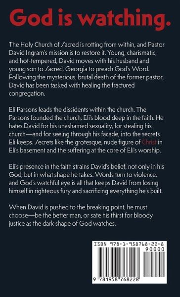 God is watching. The Holy Church of Sacred is rotting from within, and Pastor David Ingram's mission is to restore it. Young, charismatic, and hot-tempered, David moves with his husband and young son to Sacred, Georgia to preach God's Word. Following the mysterious, brutal death of the former pastor, David has been tasked with healing the fractured congregation. Eli Parsons leads the dissidents within the church. The Parsons founded the church, Eli's blood deep in the faith. He hates David for his unashamed sexuality, for stealing his church-and for seeing through his facade, into the secrets Eli keeps. Secrets like the grotesque, nude figure of Christ in Eli's basement and the suffering at the core of Eli's worship. Eli's presence in the faith strains David's belief, not only in his God, but in what shape he takes. Words turn to violence, and God's watchful eye is all that keeps David from losing himself in righteous fury and sacrificing everything he's built. When David is pushed to the breaking point, he must choose-be the better man, or sate his thirst for bloody justice as the dark shape of God watches.
