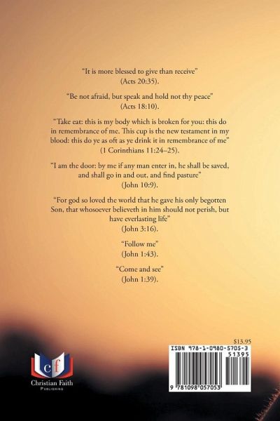 "It is more blessed to give than receive" (Acts 20:35). "Be not afraid, but speak and hold not thy peace" (Acts 18:10). "Take eat: this is my body which is broken for you: this do in remembrance of me. This cup is the new testament in my blood: this do ye as oft as ye drink it in remembrance of me" (1 Corinthians 11:24-25). "I am the door: by me if any man enter in, he shall be saved, and shall go in and out, and find pasture" (John 10:9). "For god so loved the world that he gave his only begotten Son, that whosoever believeth in him should not perish, but have everlasting life" (John 3:16). "Follow me" (John 1:43). "Come and see" (John 1:39).