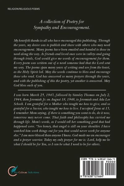 A collection of Poetry for Sympathy and Encouragement. My heartfelt thanks to all who have encouraged this publishing. Through the years, my desire was to publish and share with others who may need encouragement. Many poems have been emailed and handed to those in need along the way. As friends and loved ones were in valleys and going through trials, God would give me words of encouragement for them. Every poem was written out of a need someone had that the Lord sent my way. The poems span many years of writing and are from the heart, as the Holy Spirit led. May the words continue to bless and encourage those who read. God has answered so many prayers through the years, and with the publishing of this the poetry, yet another is answered. May God bless each of you.