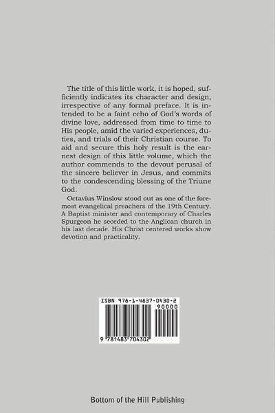 The title of this little work, it is hoped, sufficiently indicates its character and design, irrespective of any formal preface. It is intended to be a faint echo of God's words of divine love, addressed from time to time to His people, amid the varied experiences, duties, and trials of their Christian course. To aid and secure this holy result is the earnest design of this little volume, which the author commends to the devout perusal of the sincere believer in Jesus, and commits to the condescending blessing of the Triune God. Octavius Winslow stood out as one of the foremost evangelical preachers of the 19th Century. A Baptist minister and contemporary of Charles Spurgeon he seceded to the Anglican church in his last decade. His Christ centered works show devotion and practicality.