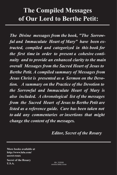 The Divine messages from the book, "The Sorrowful and Immaculate Heart of Mary" have been extracted, compiled and categorized in this book for the first time in order to present a cohesive continuity and to provide an enhanced clarity to the main overall Messages from the Sacred Heart of Jesus to Berthe Petit. Chapter 1 provides the messages on the mission given to Berthe Petit. Chapter 2 presents the compiled summary of messages from Jesus Christ as a Sermon on the Devotion while Chapter 3 contains the compiled messages from the Blessed Virgin Mary. Chapter 4 provides a summary on the Practice of the Devotion to the Sorrowful and Immaculate Heart of Mary. Chapter 5 features compiled messages concerning WWI and WWII. A chronological list of the messages from the Sacred Heart of Jesus to Berthe Petit are listed in Chapter 6 as a reference guide. Care has been taken not to add any commentaries or insertions that might change the content of the messages.