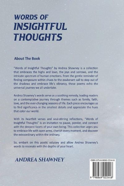 Words of Insightful Thoughts by Andrea Shawney is a collection that embraces the highs and lows, the joys and sorrows, and the intricate spectrum of human emotions. From the gentle reminder of finding composure within chaos to the exuberant call to step out of the shadows and embrace life's vibrancy, these poems echo the universal journey we all undertake. Andrea Shawney's words serve as a soothing remedy, leading readers on a contemplative journey through themes such as family, faith, love, and the ever-changing seasons of life. Each piece encourages us to find significance in the smallest details and appreciate the hues that color our world. With its heartfelt verses and soul-stirring reflections, "Words of Insightful Thoughts" is an invitation to pause, ponder, and connect with the deepest facets of your own being. This collection urges you to embrace life with open arms, cherish every moment, and discover the extraordinary within the ordinary. So, embark on this poetic odyssey and allow Andrea Shawney's words to resonate with the depths of your heart.
