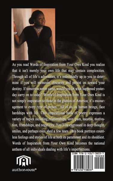 This book of poetry is something everyone can relate to young or old. No matter the ethnic background. This book is something that everyone can read and take something from. Think about it, life would be so perfect if we human beings didn't run off emotions, but because we do, life is imperfect. I'm pretty sure if you pay your bills late or spend too much money at the mall, it's no big deal. But, as soon as someone betrays your trust or even break your heart. Hell break loose. It's the truth, we human beings are the most emotional creatures that walk amongs this Earth. This book can be read from the ghetto to the suburbs to even the white house. It's inspirational because it's relevant and it's inspiring to know someone has been through what you have, and you're not alone. It's so inspiring to know that same person made it through it all so it gives you no excuse to not move forward in this life.