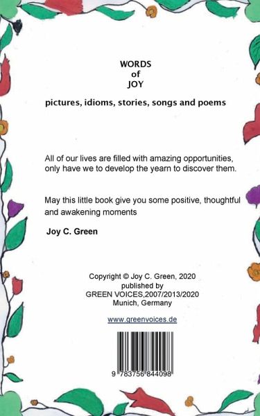 WORDS of JOY pictures, idioms, stories, songs and poems All of our lives are filled with amazing opportunities,only have we to develop the yearn to discover them.May this little book give you some positive, thoughtfuland awakening momentsJoy C. Green