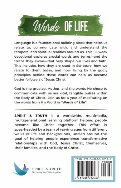 Language is a foundational building block that helps us relate to, communicate with, and understand the temporal and spiritual realities around us. This 52-week devotional explores crucial words and terms-and the truths they evoke-that help shape our lives and faith. This includes how they are used in Scripture, how we relate to them today, and how living by the godly principles behind these words can help us become better followers of Jesus Christ. God is the greatest Author, and the words He chose to communicate with us are vital, tangible pulses within the Body of Christ. Join us for a year of meditating on the words from His Word in "Words of Life"!