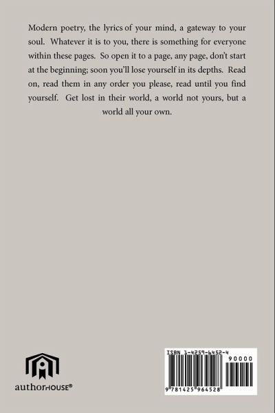 Modern poetry, the lyrics of your mind, a gateway to your soul. Whatever it is to you, there is something for everyone within these pages. So open it to a page, any page, don't start at the beginning; soon you'll lose yourself in its depths. Read on, read them in any order you please, read until you find yourself. Get lost in their world, a world not yours, but a world all your own.