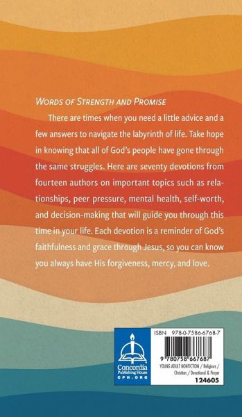 Teens need devotions written for them, to them, about things they're going through. Sometimes it might be uncomfortable to go to a trusted adult or a pastor about certain topics. That's where this devotional comes in. Give the youth in your life 70 different devotions on topics they either already do, or will be needing guidance on in the future. Each devotion is written by an author who has been through the problem and can help guide today's youth through it. The fourteen authors in this book are at various stages of life, from young adults finishing college, to pastors who have seen people through all sorts of life issues. No matter the problem, and no matter the situation, this devotional is for all youth as a guidebook to how God wants them to live life. Topics Include: Addiction - Anger - Anxiety - Singleness - Being Christian - Loss - Evolution - Friendships - Grief - Identity - Jealousy - Pain - Peer Pressure - Phones - Social Media - Sexuality - Rejection - Self-Worth - Tolerance - Vocation - Humanity - Parents - Siblings - Sin - and so many more...