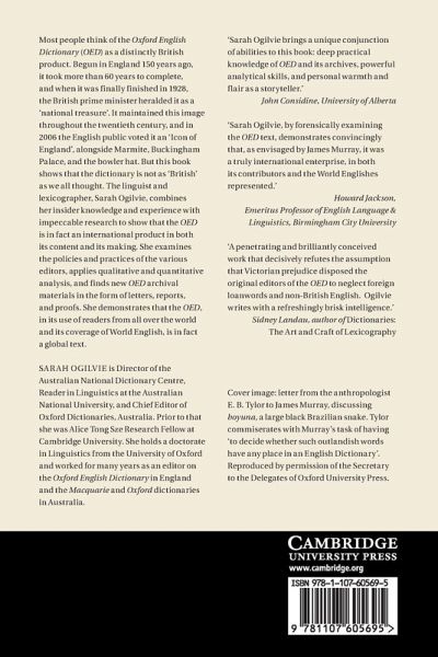 Most people think of the Oxford English Dictionary (OED) as a distinctly British product. Begun in England 150 years ago, it took more than 60 years to complete and, when it was finally finished in 1928, the British prime minister heralded it as a 'national treasure'. It maintained this image throughout the twentieth century, and in 2006 the English public voted it an 'Icon of England', alongside Marmite, Buckingham Palace and the bowler hat. However, this book shows that the dictionary is not as 'British' as we all thought. The linguist and lexicographer, Sarah Ogilvie, combines her insider knowledge and experience with impeccable research to show that the OED is in fact an international product in both its content and its making. She examines the policies and practices of the various editors, applies qualitative and quantitative analysis, and finds new OED archival materials in the form of letters, reports and proofs. She demonstrates that the OED, in its use of readers from all over the world and its coverage of World English, is in fact a global text.