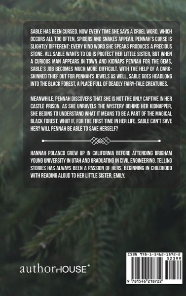 Sable has been cursed. Now every time she says a cruel word, which occurs all too often, spiders and snakes appear. Pennahs curse is slightly different: every kind word she speaks produces a precious stone. All Sable wants to do is protect her little sister, but when a curious man appears in town and kidnaps Pennah for the gems, Sables job becomes much more difficult. With the help of a dark-skinned thief out for Pennahs jewels as well, Sable goes headlong into the Black Forest, a PLACE full of deadly fairy-tale creatures. Meanwhile, Pennah discovers that she is not the only captive in her castle prison. As she unravels the mystery behind her kidnapper, she begins to understand what it means to be a part of the magical Black Forest. What if, for the first time in her life, Sable cant save her? Will Pennah be able to save herself?