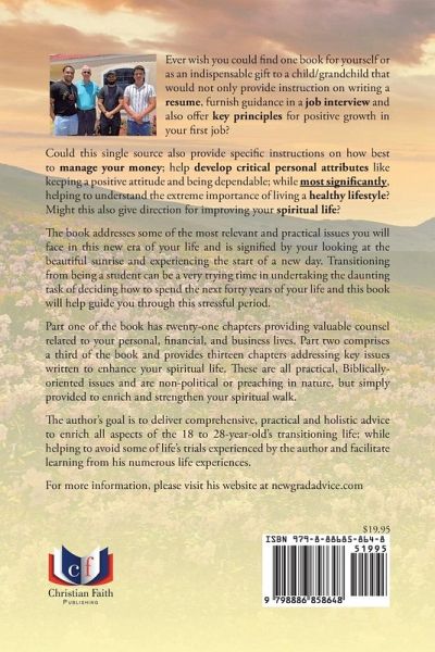 Ever wish you could find one book for yourself or as an indispensable gift to a child/grandchild that would not only provide instruction on writing a resume, furnish guidance in a job interview and also offer key principles for positive growth in your first job? Could this single source also provide specific instructions on how best to manage your money; help develop critical personal attributes like keeping a positive attitude and being dependable; while most significantly, helping to understand the extreme importance of living a healthy lifestyle? Might this also give direction for improving your spiritual life? The book addresses some of the most relevant and practical issues you will face in this new era of your life and is signified by your looking at the beautiful sunrise and experiencing the start of a new day. Transitioning from being a student can be a very trying time in undertaking the daunting task of deciding how to spend the next forty years of your life and this book will help guide you through this stressful period. Part one of the book has twenty-one chapters providing valuable counsel related to your personal, financial, and business lives. Part two comprises a third of the book and provides thirteen chapters addressing key issues written to enhance your spiritual life. These are all practical, Biblically-oriented issues and are non-political or preaching in nature, but simply provided to enrich and strengthen your spiritual walk. The author's goal is to deliver comprehensive, practical and holistic advice to enrich all aspects of the 18 to 28-year-old's transitioning life; while helping to avoid some of life's trials experienced by the author and facilitate learning from his numerous life experiences. For more information, please visit his website at newgradadvice.com