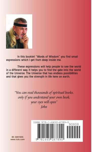 In this book "Words of Wisdom" you find small expressions which I get from deep inside me. These expressions will help people to see the world in a different way. It helps you to find the gate into the world of the Universe. The Universe that has endless possibilities and that gives you the strength in life here on earth.