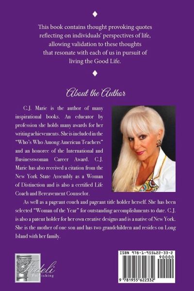 This book contains thought provoking quotes reflecting on individuals' perspectives of life, allowing validation to these thoughts that resonate with each of us in pursuit of living the Good Life.