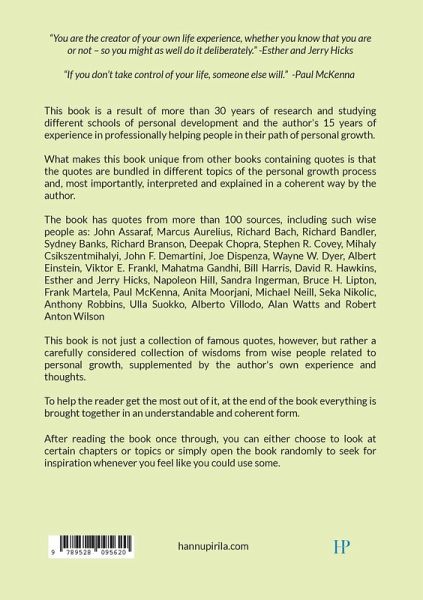 This book is a result of more than 30 years of research and studying different schools of personal development and the author's 15 years of experience as a Master Trainer of NLP and clinical hypnotherapist in professionally helping people in their path of personal growth. What makes this book unique from other books containing quotes is that the quotes are bundled in different topics of the personal growth process and, most importantly, interpreted and explained in a coherent way by the author. The book has quotes from more than 100 sources, including such wise people as: John Assaraf, Marcus Aurelius, Richard Bach, Richard Bandler, Sydney Banks, Richard Branson, Deepak Chopra, Stephen R. Covey, Mihaly Csikszentmihalyi, John F. Demartini, Joe Dispenza, Wayne W. Dyer, Albert Einstein, Viktor E. Frankl, Mahatma Gandhi, Bill Harris, David R. Hawkins, Esther and Jerry Hicks, Napoleon Hill, Sandra Ingerman, Bruce H. Lipton, Frank Martela, Paul McKenna, Anita Moorjani, Michael Neill, Seka Nikolic, Anthony Robbins, Ulla Suokko, Alberto Villodo, Alan Watts and Robert Anton Wilson This book is not just a collection of famous quotes, however, but rather a carefully considered collection of wisdoms from wise people related to personal growth, supplemented by the author's own experience and thoughts. The book covers, among others, the following topics related to personal growth: - Our Experience of Life - Creating a New Life - Vision, Goals and Directions - Meaning and Purpose - Values And Beliefs - Beliefs and Fears - Happiness - Success - Growth and Change - Gratitude - Abundance - Freedom - Love - Health and Well-Being To help the reader get the most out of it, at the end of the book everything is brought together in an understandable and coherent form. After reading the book once through, you can either choose to look at certain chapters or topics or simply open the book randomly to seek for inspiration whenever you feel like you could use some.