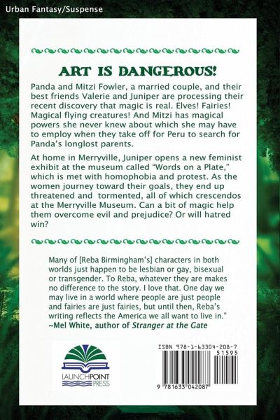 "An exciting adventure with unique characters navigating their way through fantasy and reality. . . [Words on a Plate is an] easy read, writing is crisp, and the mystical characters are interesting with creative powers." ~Katie Cotter, former news editor, The Advocate Panda and Mitzi Fowler, a married couple, and their best friends Valerie and Juniper are processing their recent discovery that magic is real. Elves! Fairies! Magical flying creatures! And Mitzi has magical powers she never knew about which she may have to employ when they take off for Peru to search for Panda's longlost parents. At home in Merryville, Juniper opens a new feminist exhibit at the museum called "Words on a Plate," which is met with homophobia and protest. As the women journey toward their goals, they end up threatened and tormented, all of which crescendos at the Merryville Museum. Can a bit of magic help them overcome evil and prejudice? Or will hatred win? "There's no way to introduce you to all the fascinating characters [in Words on a Plate that] Reba has created in her new take on the war between this world and the world of magic. But I can say this: Many of her characters in both worlds just happen to be lesbian or gay, bisexual or transgender. To Reba, whatever they are makes no difference to the story. I love that. One day we may live in a world where people are just people and fairies are just fairies, but until then, Reba's writing reflects the America we all want to live in." ~Mel White, author of Stranger at the Gate: To be Gay and Christian in America and Holy Terror: Lies the Christian Right Tell Us to Deny Gay Equality