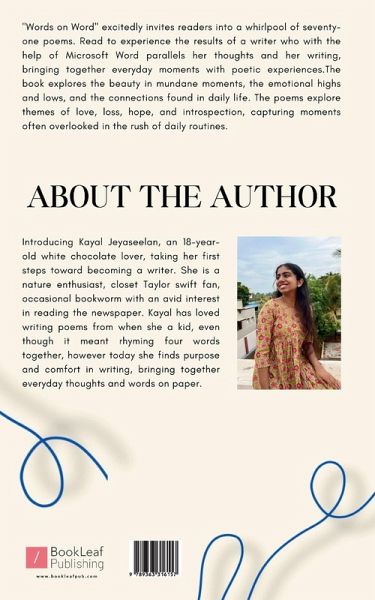"Words on Word" excitedly invites readers into a whirlpool of seventy-one poems. Read to experience the results of a writer who with the help of Microsoft Word parallels her thoughts and her writing, bringing together everyday moments with poetic experiences.The book explores the beauty in mundane moments, the emotional highs and lows, and the connections found in daily life. The poems explore themes of love, loss, hope, and introspection, capturing moments often overlooked in the rush of daily routines.
