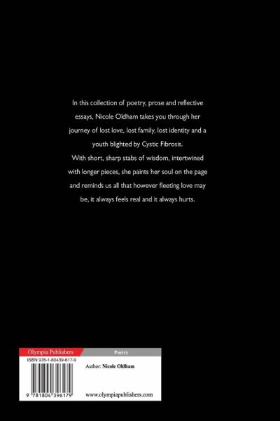 In this collection of poetry, prose and reflective essays, Nicole Oldham takes you through her journey of lost love, lost family, lost identity and a youth blighted by Cystic Fibrosis. With short, sharp stabs of wisdom, intertwined with longer pieces, she paints her soul on the page and reminds us all that however fleeting love may be, it always feels real and it always hurts.