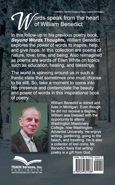 In this follow-up to his previous poetry book, Beyond Words Thoughts, William Benedict explores the power of words to inspire, help, and give hope. In this collection are poems of nature, love, time, and being. Also reimagined as poems are words of Ellen White on topics such as education, healing, and blessings. The world is spinning around us in such a frantic state that sometimes one must choose to be still. So, take a moment to come into His presence and contemplate the beauty and power of words in this inspirational book of poetry.