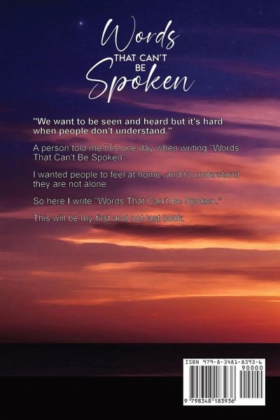 "We want to be seen, and heard but it's hard when people don't understand." A person told me this one day when writing "Words That Can't Be Spoken". I wanted people to feel at home, and to understand they are not alone. So here I write "Words That Can't Be Spoken". This will be my first and not last book.
