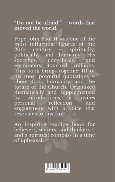 "Do not be afraid!" - words that moved the world.Pope John Paul II was one of the most influential figures of the 20th century - spiritually, politically, and humanly. His speeches, encyclicals, and encounters touched millions. This book brings together 111 of his most powerful quotations - about God, humanity, and the future of the Church. Organized thematically and supplemented by introductions, it invites personal reflection and engagement with a voice that resonates to this day.