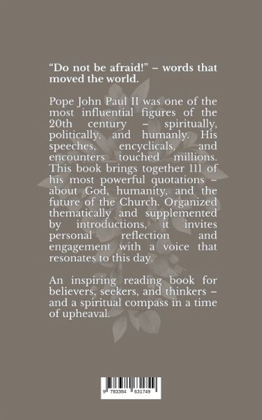 "Do not be afraid!" - words that moved the world.Pope John Paul II was one of the most influential figures of the 20th century - spiritually, politically, and humanly. His speeches, encyclicals, and encounters touched millions. This book brings together 111 of his most powerful quotations - about God, humanity, and the future of the Church. Organized thematically and supplemented by introductions, it invites personal reflection and engagement with a voice that resonates to this day.