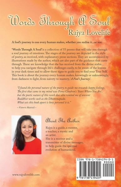 A fool's journey is one every human makes, whether you realise it...or not. 'Words Through A Soul' is a collection of 55 poems that will take you through a soul journey of emotions. The stages of the journey are depicted in the style of poetry, as received, with explanatory prose sections. They are accompanied by illustrations made by the author, which are also part of the guidance that came through. These are knowledge that she has received from the divine realm...to help you navigate through life's challenges easily, to be aware of the lessons in your dark times and to allow these signs to guide you to find your True Self. This book is about the journey every human makes, knowingly or unknowingly, from darkness to light, from naivety to mastery, 'A Fool's Journey'.
