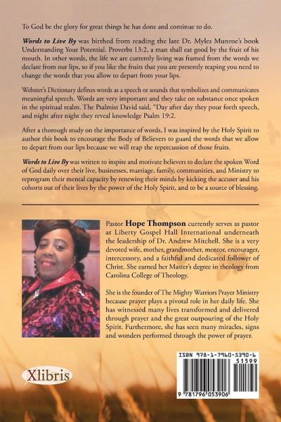 To God be the glory for great things he has done and continue to do. Words to Live By was birthed from reading the late Dr. Myles Munroe's book Understanding Your Potential. Proverbs 13:2, a man shall eat good by the fruit of his mouth. In other words, the life we are currently living was framed from the words we declare from our lips, so if you like the fruits that you are presently reaping you need to change the words that you allow to depart from your lips. Webster's Dictionary defines words as a speech or sounds that symbolizes and communicates meaningful speech. Words are very important and they take on substance once spoken in the spiritual realm. The Psalmist David said, "Day after day they pour forth speech, and night after night they reveal knowledge Psalm 19:2. After a thorough study on the importance of words, I was inspired by the Holy Spirit to author this book to encourage the Body of Believers to guard the words that we allow to depart from our lips because we will reap the repercussion of those fruits. Words to Live By was written to inspire and motivate believers to declare the spoken Word of God daily over their live, businesses, marriage, family, communities, and Ministry to reprogram their mental capacity by renewing their minds by kicking the accuser and his cohorts out of their lives by the power of the Holy Spirit, and to be a source of blessing.