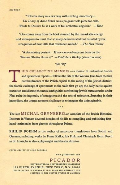 This collective memoir--a mosaic of individual diaries, journals, and accounts--follows the fate of the Warsaw Jews from the first bombardments of the Polish capital to the razing of the Jewish district: the frantic exchange of apartments as the walls first go up; the daily battle against starvation and disease; the moral ambiguities confronting Jewish bureaucracies under Nazi rule; the ingenuity of smugglers; and the acts of resistance. Stunning in their immediacy, these urgent accounts challenge us to imagine the unimaginable.