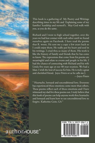 This book is a gathering of my poetry and writings describing times in my life and explaining some of my family's hardship and turmoil. May God walk with you as you do the same. Richard and I went to high school together, over the years we had lost contact with each other until we found ourselves again on Facebook. I have read the poems that R. wrote. He sent me a copy a few years back so I could enjoy them. He really put his heart and soul in his writings. I cried thru so many of them. His work is like the history of family and friends that he has come to know. The expressions that come from his poems are meaningful and relate to events and people in his life. I had the chance of connecting with Richard and his wife Linda five years ago at our 40 year reunion. We had a blast. I wish the best of success for him. He is truly a great and cherished friend. Joyce Peters or as he calls me J. -Joyce Peters " Heartache, betrayal and unconditional love. Everyone has experienced these emotions; some more than others. These poems reflect each of these emotions and I have witnessed my dad live these poems out. I truly believe that this book of poems can help anyone work thru heartache and betrayal and learn how to use unconditional love to forgive. Katherine Goin, GA "