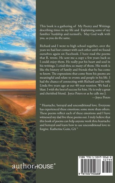This book is a gathering of my poetry and writings describing times in my life and explaining some of my family's hardship and turmoil. May God walk with you as you do the same. Richard and I went to high school together, over the years we had lost contact with each other until we found ourselves again on Facebook. I have read the poems that R. wrote. He sent me a copy a few years back so I could enjoy them. He really put his heart and soul in his writings. I cried thru so many of them. His work is like the history of family and friends that he has come to know. The expressions that come from his poems are meaningful and relate to events and people in his life. I had the chance of connecting with Richard and his wife Linda five years ago at our 40 year reunion. We had a blast. I wish the best of success for him. He is truly a great and cherished friend. Joyce Peters or as he calls me J. -Joyce Peters " Heartache, betrayal and unconditional love. Everyone has experienced these emotions; some more than others. These poems reflect each of these emotions and I have witnessed my dad live these poems out. I truly believe that this book of poems can help anyone work thru heartache and betrayal and learn how to use unconditional love to forgive. Katherine Goin, GA "