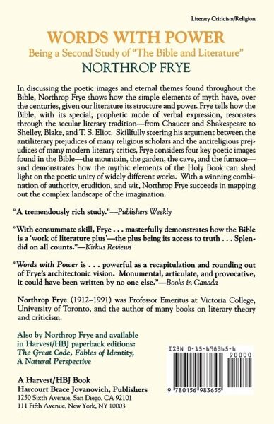 Frye continues his exploration, begun in The Great Code, of the influence of Biblical themes and forms of expression on Western literature, with discussions of authors ranging from Chaucer and Shakespeare to Yeats and Eliot. Frye identifies four key elements found in the Bible-the mountain, the garden, the cave, and the furnace-and describes how they recur in later secular writings. Indices.