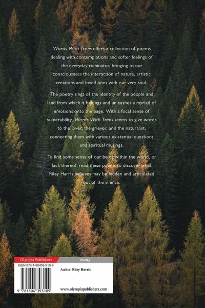 Words With Trees offers a collection of poems dealing with contemplations and softer feelings of the everyday ruminator, bringing to our consciousness the interaction of nature, artistic creations and loved ones with our very soul. The poetry sings of the identity of the people and land from which it belongs and unleashes a myriad of emotions onto the page. With a focal sense of vulnerability, Words With Trees seems to give words to the lover, the griever, and the naturalist, connecting them with various existential questions and spiritual musings. To find some sense of our being within the world, or lack thereof, read these poems to discover what Riley Harris believes may be hidden and articulated out of the silence.