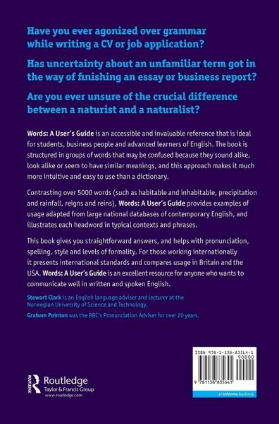Words: A User's Guide is an accessible and invaluable reference that is ideal for students, business people and advanced learners of English. The book is structured in groups of words that may be confused because they sound alike, look alike or seem to have similar meanings, and this approach makes it much more intuitive and easy to use than a dictionary. Contrasting over 5000 words (such as habitable and inhabitable, precipitation and rainfall, reigns and reins), Words: a User's Guide provides examples of usage adapted from large national databases of contemporary English, and illustrates each headword in typical contexts and phrases. This book gives you straightforward answers, and helps with pronunciation, spelling, style and levels of formality. For those working internationally it presents international standards and compares usage in Britain and the USA. Words: A User's Guide is an excellent resource for anyone who wants to communicate well in written and spoken English. "At last! A book about the use of words that clarifies and de-mystifies in an eminently usable way. I would recommend it to anyone who wants to write well. It is a book to keep." Sandy Gilkes, Head of the Centre for Academic Practice, University of Northampton "Rigorous, fresh, intriguing and downright useful, it deserves a place on every properly stocked reference shelf." Brian Cathcart, Professor of Journalism, Kingston University "From the pedantic to the permissive, everyone who's interested in the English language and the way we speak and write it will want a copy of this practical, entertaining book." Wynford Hicks (author of Quite Literally and The Basics of English Usage)