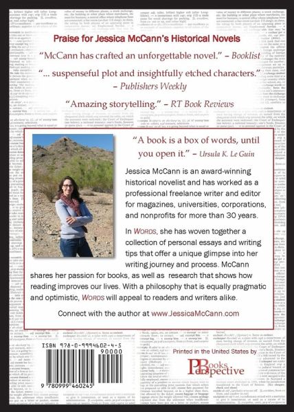 "A book is a box of words, until someone opens it." ~ Ursula K. Le Guin Jessica McCann has woven together a collection of personal essays and writing tips that offer a unique glimpse into her writing journey and process. She is an award-winning historical novelist and has worked as a professional freelance writer and editor for magazines, universities, corporations, and nonprofits for more than thirty years. In Words, McCann shares her passion for books, as well as research that shows how reading improves our lives. With a philosophy that is equally pragmatic and optimistic, Words will appeal to readers and writers alike.