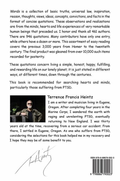 Words was first published in 2016 and contained 686 quotations. This new edition contains 946 quotations including 260 that were previously selected but omitted from the first edition. The original manuscript title, "Words," has been retained. Words presents wisdom written and collected across three millenniums. This complete hand-printed manuscript is more personal, authentic and appropriate than prior editions. It is my wish that these words bring comfort, hope and love to those in need. Words is a collection of basic truths, universal law, inspiration, reason, thoughts, views, ideas, concepts, convictions, and facts in the format of concise quotations. These observations and realizations are from the minds, hearts and life experiences of very remarkable human beings that preceded us. I honor and thank all 461 authors. There are 946 quotations. Many contributors have only one entry, while others have a dozen or more. This assortment of easy reading covers the previous 3,000 years from Homer to the twentieth century. The final product was gleaned from over 10,000 such items recorded for posterity. These quotations concern living a simple, honest, happy, fulfilling, and rewarding life on our lonely planet; it is just stated in different ways, at different times, down through the centuries. This book is recommended for searching hearts and minds, particularly those suffering from PTSD.
