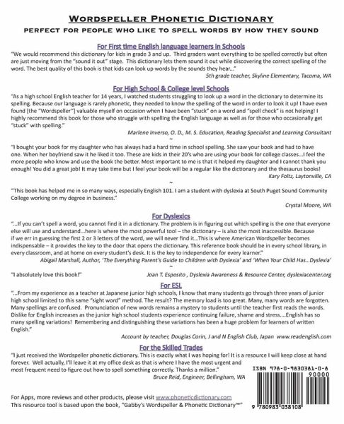 Over 70,000 entries of commonly used American English words with multiple misspellings per word based upon their phonetic sound. Brief definitions allow for quickly ascertaining the proper word you wish to use. Extensive cross-referencing allows for words that are either similar in meaning and/or spelling. All available prefixes are defined. Each correctly spelled word lists all potential suffix endings leaving no guesswork as to how to spell the future and past tense of a word. Use this reference tool as a bridge to go from the sound of your word to a standard dictionary if further comprehension is needed. Proper nouns are not listed unless they are common in everyday communication. Proper nouns which are included in this resource tool; days of the week, months of the year, common medical and legal terms, common plants, animals and others which can be cross-referenced with a word which may not be a proper noun. Helpful for English as a First Language (ESL) for 3rd-5th grade, English as a Second Language (ESL) and anyone who is dyslexic, autistic, or has any other learning disability. Also helpful to those who simply want to quickly find the spelling of their word phonetically. For poets seeking rhyming words and synonyms and for those who want to know how suffix endings are spelled out when added to a root word. This book has been accepted by some California nursing schools as admissible to use in exams. As well, the book is designed for use in all testing/exams by all school levels.