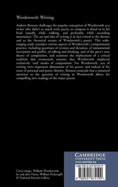 Andrew Bennett challenges the popular conception of Wordsworth as a writer who didn't so much write poetry as compose it aloud or in his head (usually while walking, and preferably while ascending mountains). The act and idea of writing is in fact central to the themes and to the rhetorical texture of Wordsworth's poetry. This wide-ranging study considers various aspects of Wordsworth's compositional practice, including questions of revision and dictation, of monumental inscription and graffiti, of talking and thinking, and of the poet's own theory of composition, and examines the implications of a critical tradition that erroneously assumes that Wordsworth employed exclusively 'oral' modes of composition. For Wordsworth, acts of writing were important dimensions of his poetry and indeed of his sense of personal and poetic identity. Bennett contends that a sustained attention to the question of writing in Wordsworth produces compelling new readings of the major poems.
