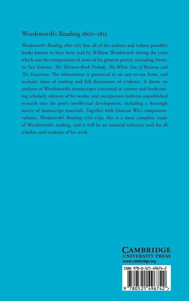 Wordsworth's Reading 1800-1815 lists all of the authors and books known to have been read by William Wordsworth during the years which saw the composition of much of his greatest poetry. It draws on hitherto unpublished research, and will be an essential reference tool for all scholars and students of Wordsworth's work.