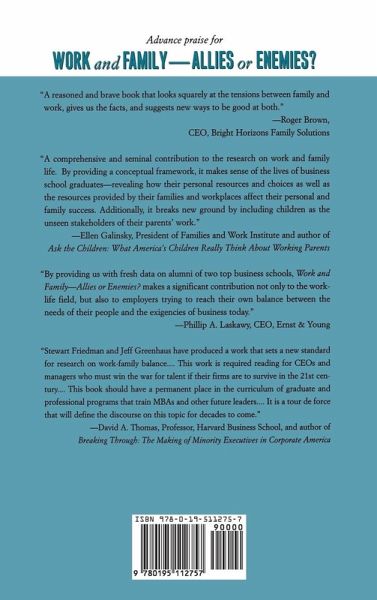 We've come a long way since the classic book The Organization Man first introduced the "ideal" 2-person career -- a full-time male breadwinner and a stay-at-home wife. What typified the '50s good life is in stark contrast to contemporary reality: 63% of all married women with children under six years old are in the workforce and 40% of all workers are part of a dual-earner couple. Work and the Family -- Allies or Enemies? offers a fresh new tens for viewing the real struggles young, career-minded professionals -- particularly women -- face in their daily battle to find ways of "getting a life" and "having it all". Based on a pioneering study that followed more than 800 business professionals through the early years of their careers and family building, this volume wilt help readers begin to make sense of the conflicting variables of gender, professional culture, social expectations, and the evolving roles of men and women in creating an integrated life. In this rich, inspiring, and at times disturbing look at how gender affects the lives of men and women trying to manage the complexities of modern living, the authors demonstrate why it is critical not only to acquire time management skills, but also to learn how to manage the boundaries between the spheres of work and family, to handle ambiguity, to manage multiple tasks simultaneously, and to build networks of support at work and in the community. Here then is a prescription for success that requires that all parties -- individuals, employers, and society -- clarify what is important, recognize and support the whole person, and continually experiment with new ways to achieve meaningful goals.