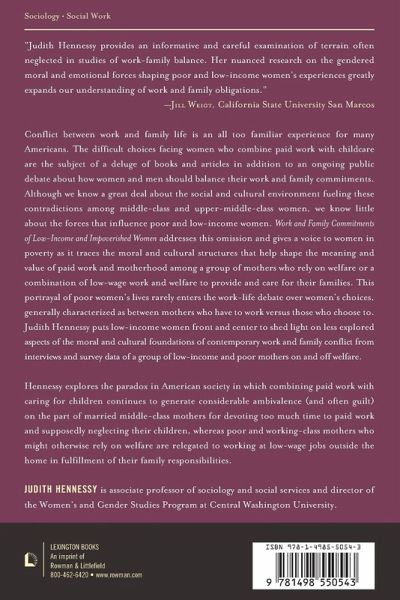 Conflict between work and family life is an all too familiar experience for many Americans. The difficult choices facing women who combine paid work with childcare are the subject of a deluge of books and articles in addition to an ongoing public debate about how women and men should balance their work and family commitments. Although we know a great deal about the social and cultural environment fueling these contradictions among middle-class and upper middle class women, we know little about the forces that influence poor and low-income women. Work and Family Commitments of Low-Income and Impoverished Women addresses this omission and gives voice to women in poverty as it traces the moral and cultural structures that help shape the meaning and value of paid work and motherhood among a group of mothers who rely on welfare or a combination of low-wage work and welfare to provide and care for their families. This portrayal of poor women's lives rarely enters the work-life debate over women's choices, generally characterized as between mothers who have to work versus those who choose to. Judith Hennessy puts low-income women front and center to shed light on less explored aspects of the moral and cultural foundations of contemporary work and family conflict from interviews and survey data of a group of low-income and poor mothers on and off welfare. Hennessey explores the paradox in American society where combining paid work with caring for children continues to generate considerable ambivalence (and often guilt) on the part of married middle-class mothers for devoting too much time to paid work and supposedly neglecting their children. While poor and working class mothers who might otherwise rely on welfare are relegated to working at low-wage jobs outside the home in fulfillment of their family responsibilities.