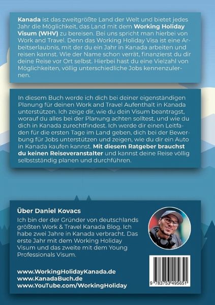 Kanada ist das zweitgrößte Land der Welt und bietet jedes Jahr die Möglichkeit, das Land und die Kultur mit dem Working Holiday Visum (WHV) zu bereisen. Bei uns spricht man hierbei von Work and Travel. Denn das Working Holiday Visa ist eine Arbeitserlaubnis, mit der du ein Jahr in Kanada arbeiten und reisen kannst. Es werden jedes Jahr ca. 5.000 kanadische WHV für Deutschland ausgelost. Wie der Name schon verrät, finanzierst du dir deine Reise vor Ort selbst. Hierbei hast du eine Vielzahl von Möglichkeiten, völlig unterschiedliche Jobs kennenzulernen.In diesem Buch werde ich dich bei deiner eigenständigen Planung für deinen Work and Travel Aufenthalt in Kanada unterstützen. Ich zeige dir, wie du dein Working Holiday Visum beantragst, worauf du alles bei der Planung achten solltest, und wie du dich in Kanada zurechtfindest. Ich werde dir einen Leitfaden für die ersten Tage im Land geben, dich bei der Bewerbung für Jobs unterstützen und zeigen, wie du dir ein Auto in Kanada kaufen kannst. Mit diesem Ratgeber brauchst du keinen Reiseveranstalter und kannst deine Reise völlig selbstständig planen und durchführen.