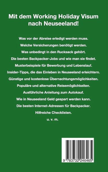 Nach Schule oder Studium zieht es junge Leute oft in die Ferne. Viele nutzen die Möglichkeit, für ein Jahr mit dem Working Holiday Visum durch Neuseeland zu reisen und nebenbei zu jobben. Dieses Buch erklärt ausführlich und verständlich, wie eine Work & Travel Reise kostengünstig organisiert und effektiv durchgeführt wird.