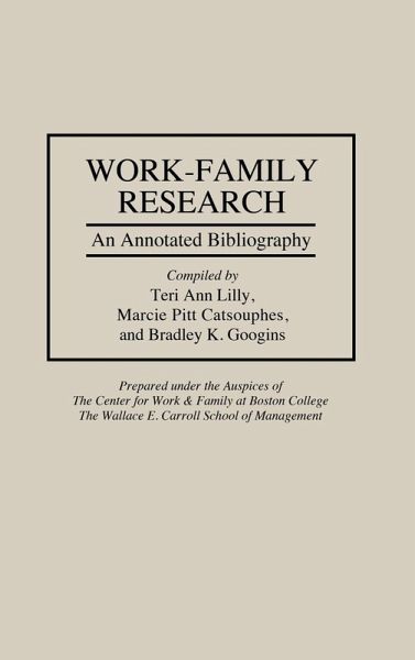 The work and family revolution of the latter part of the 20th century has profoundly changed the social structures, institutions, and cultures that constitute the fabric of our lives. Given the nature of work and family changes, it is little wonder that numerous social science researchers have studied these changes and their impacts on society. This bibliography seeks to identify the primary thematic and topical strands that have contributed to the understanding of the work-family field. The bibliography is organized by major themes and topics. Within each chapter, entries for articles, books, chapters, reports, and other materials are organized alphabetically and provide full citations as well as annotations. This will be a major research tool for students, academics, and professionals with interests in the contemporary family and work-family roles.